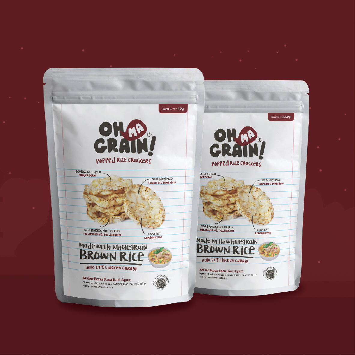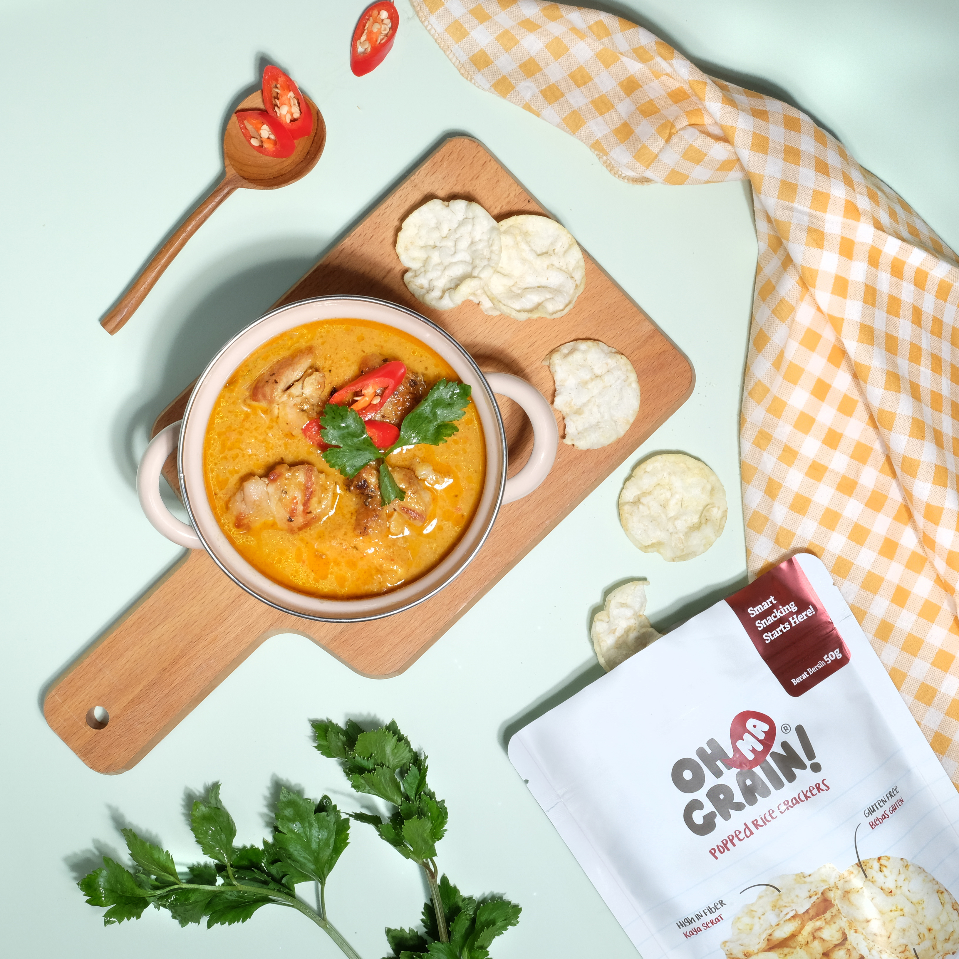 Oh Ma Grain! Chicken Curry is popped rice crackers which are made from a mixture of organic brown and white rice. It's neither fried nor baked, but POPPED.